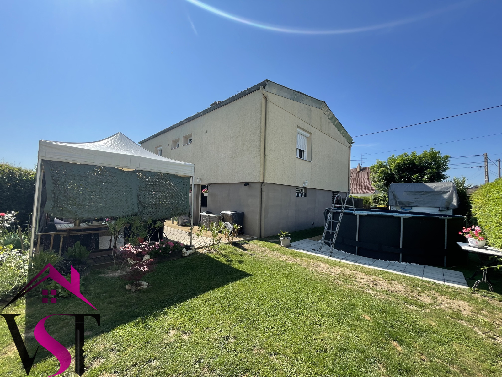 Terrain clos et arboré de 447m² avec piscine hors sol, terrasse aménagée et jardin.
