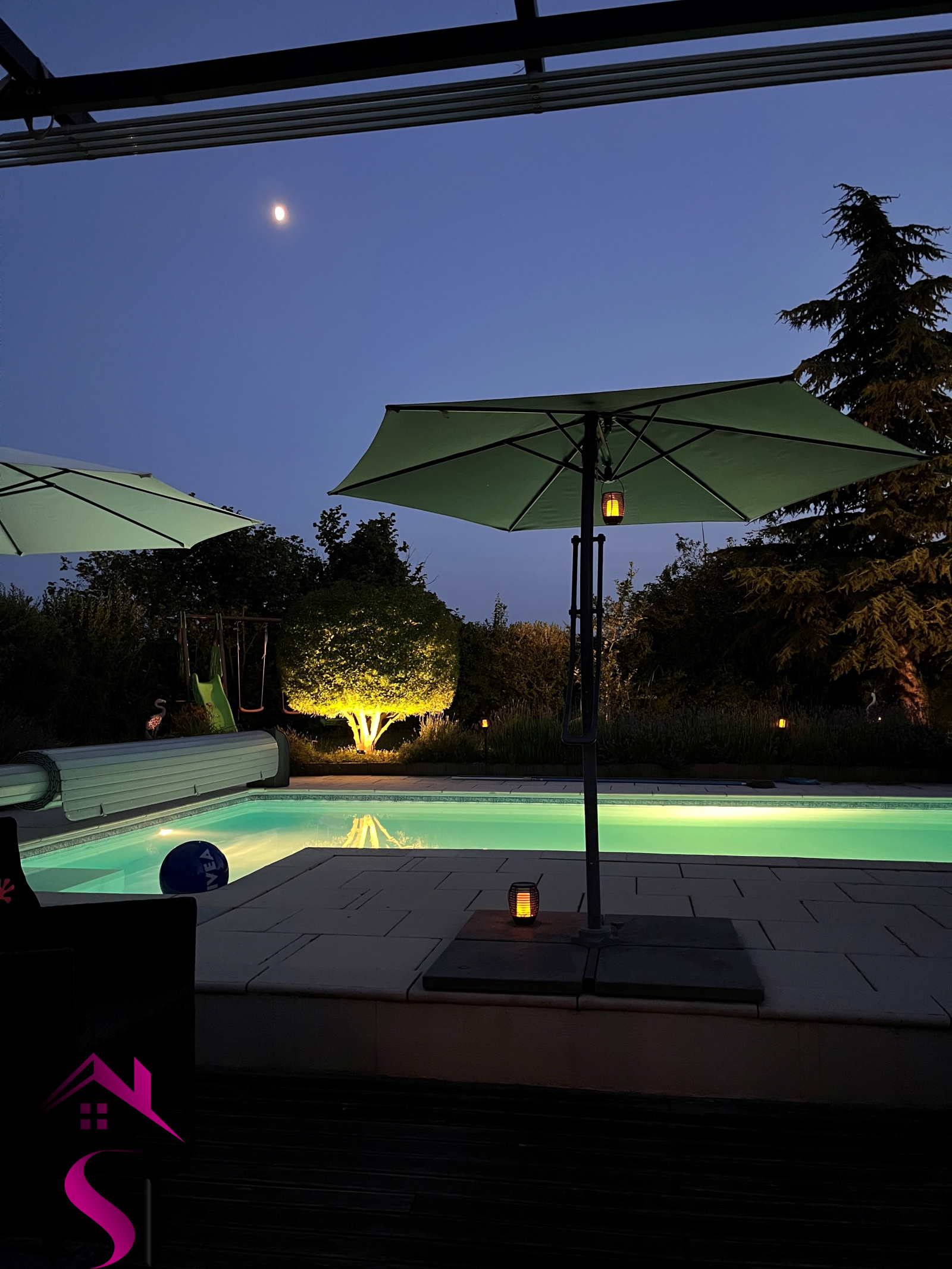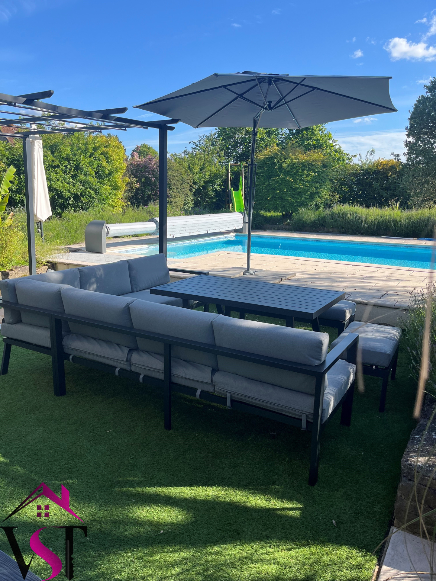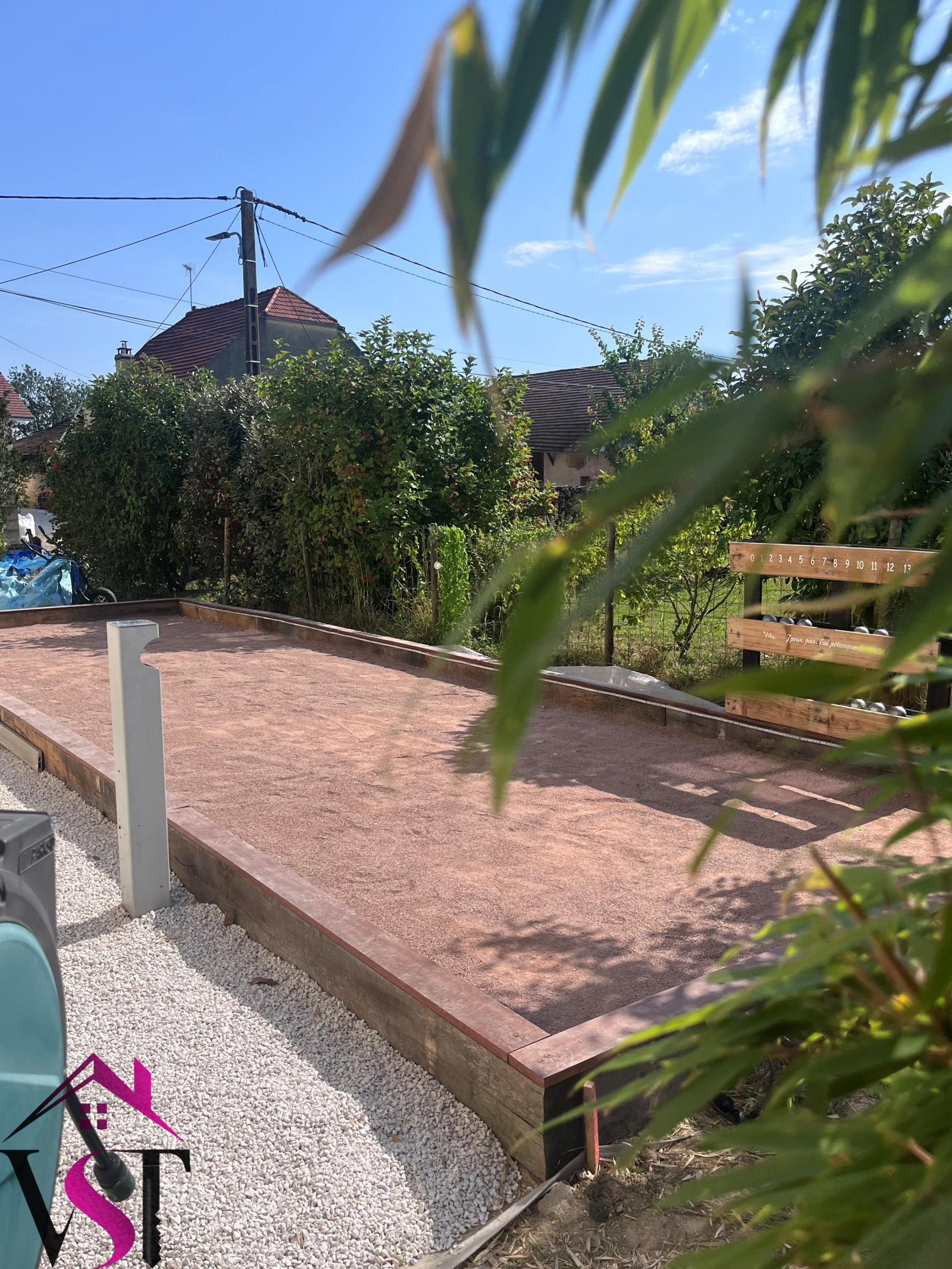 Cour, terrasse et jardin d'environ 1000m² avec piscine enterrée chauffée et sécurisée avec volet motorisé et terrain de pétanque.