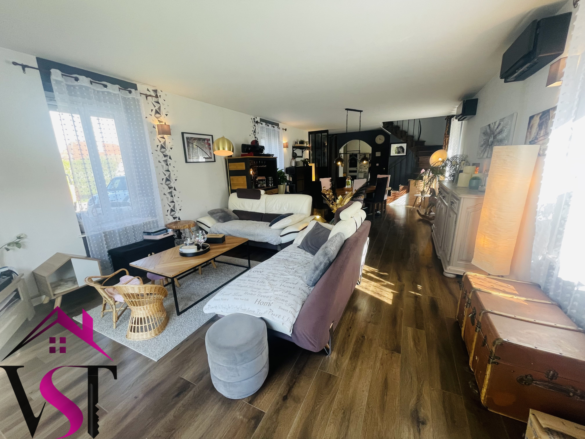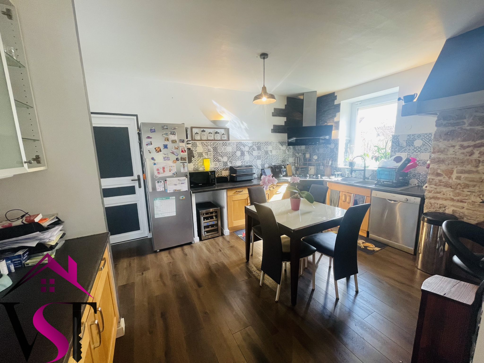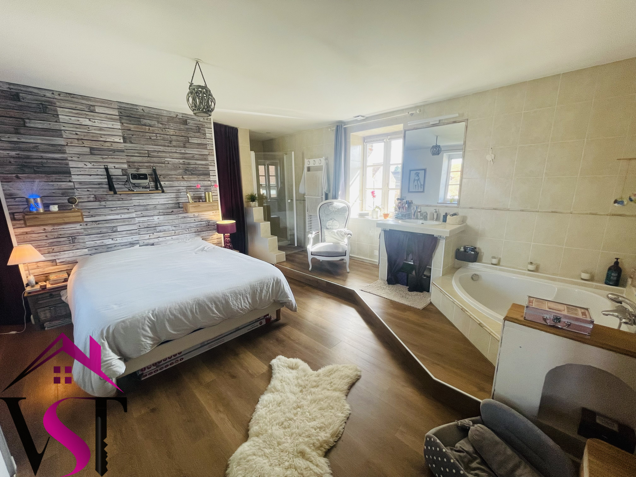 entrée, cuisine dînatoire équipée avec four à pain ouverte sur vaste salon-séjour d'environ 48m² avec accès terrasse, 4 chambres dont une magnifique chambre parentale avec salle de bains et dressing, salle d'eau, mezzanine avec coin bureau, 2 WC et dégagements.