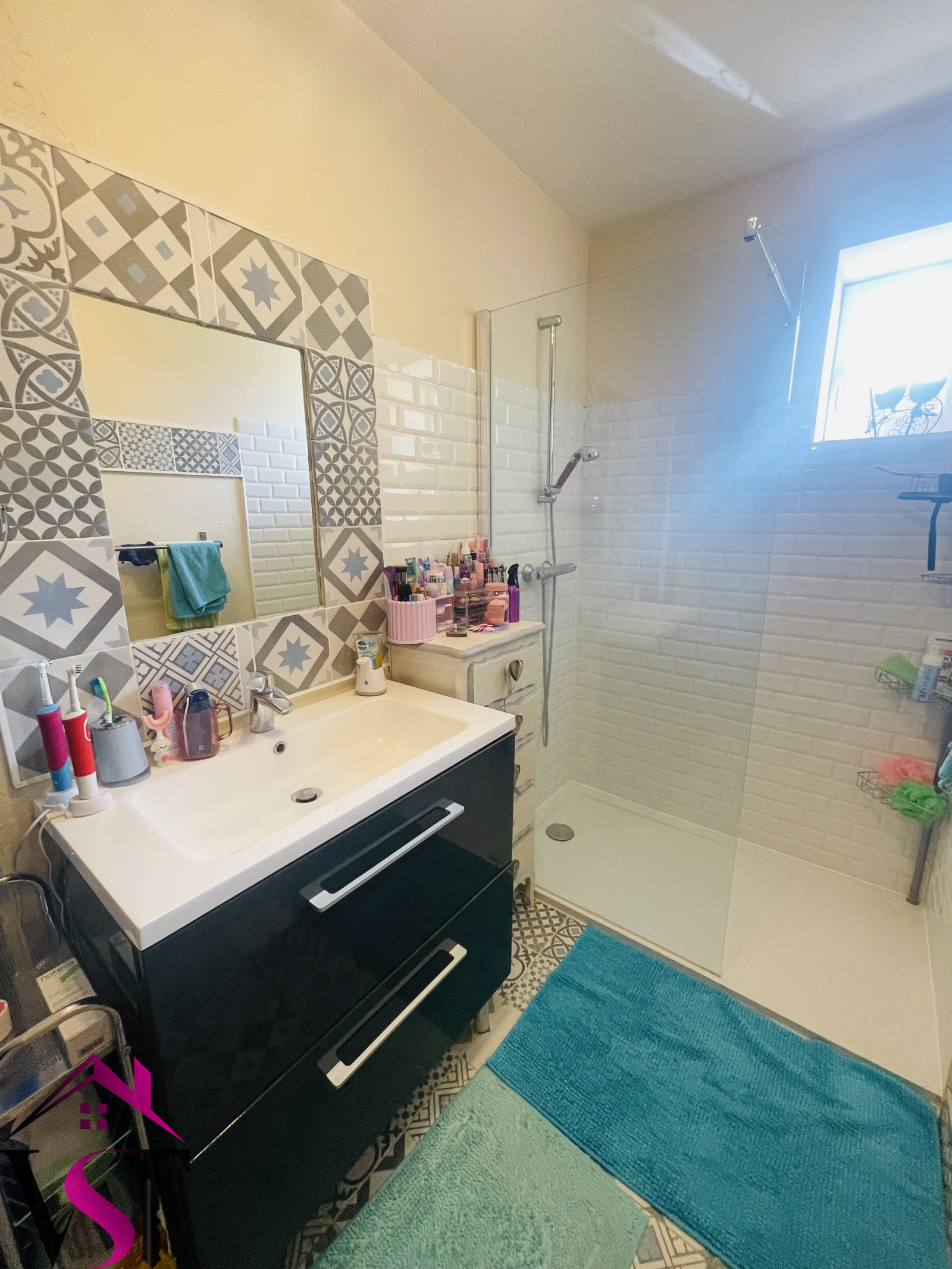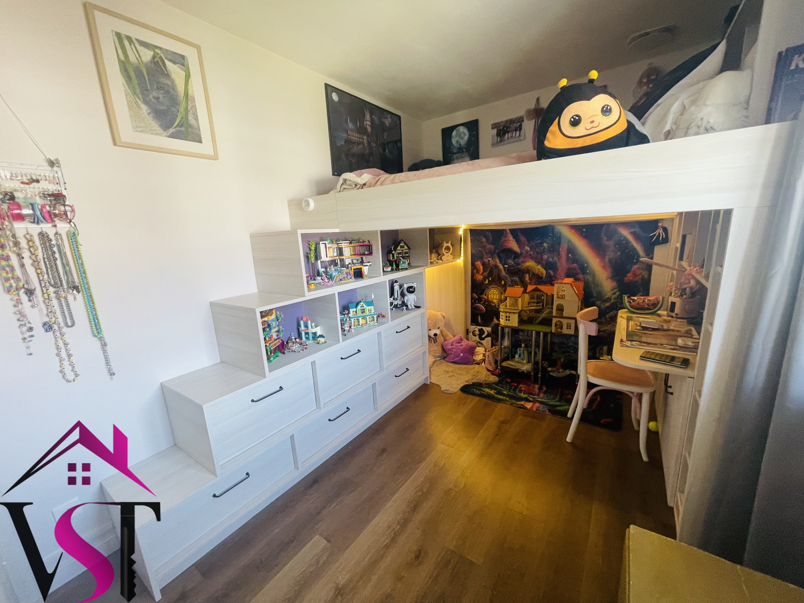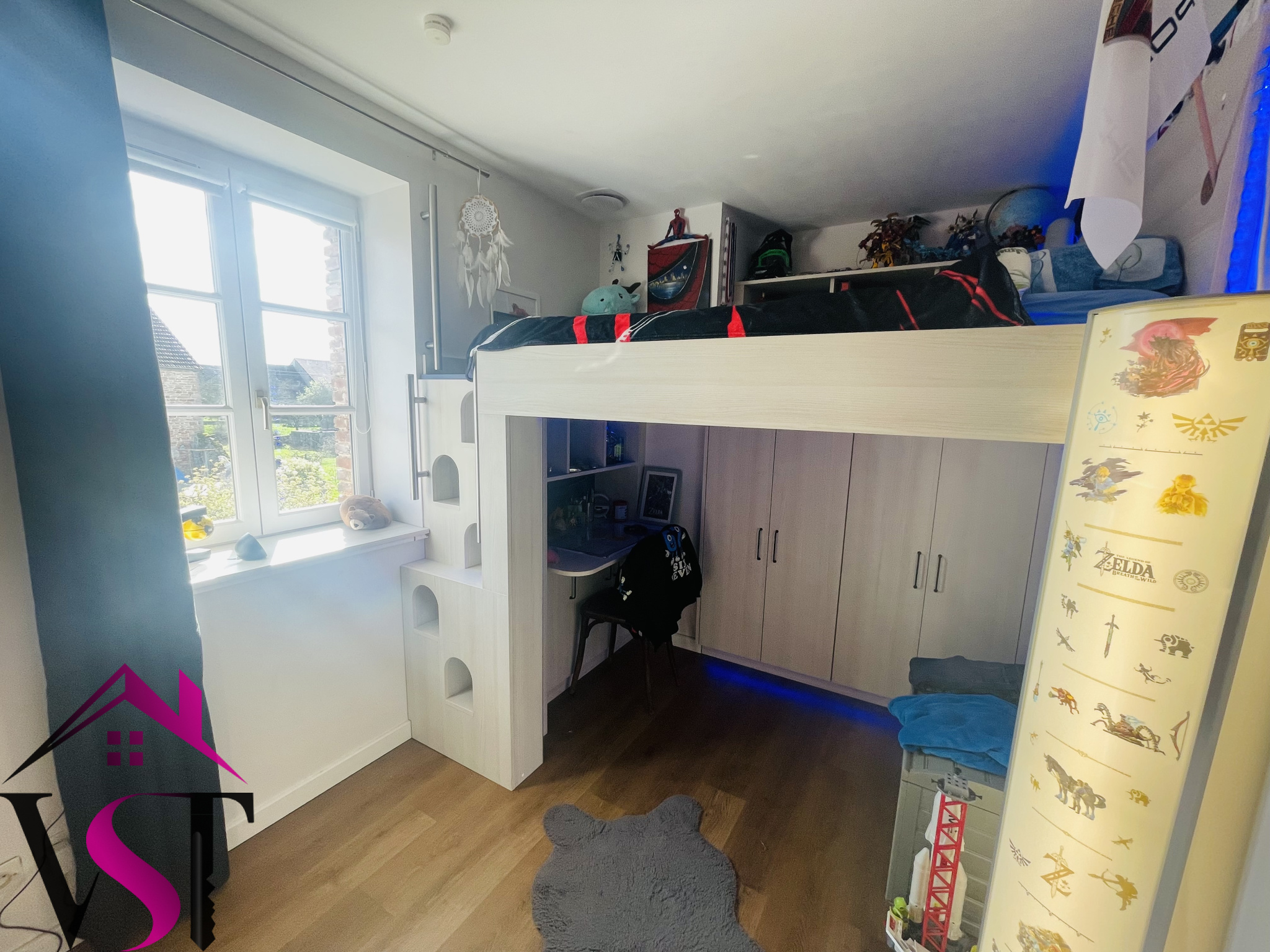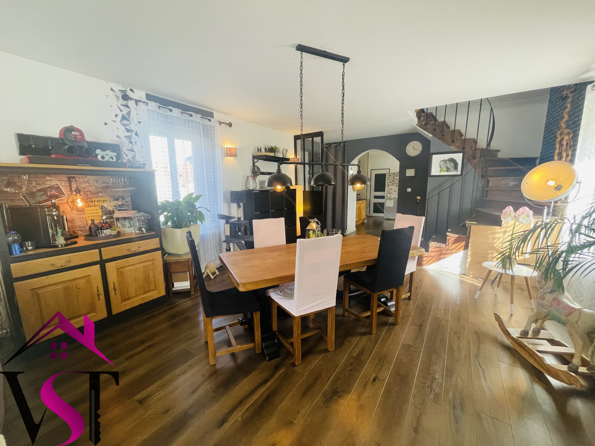 entrée, cuisine dînatoire équipée avec four à pain ouverte sur vaste salon-séjour d'environ 48m² avec accès terrasse, 4 chambres dont une magnifique chambre parentale avec salle de bains et dressing, salle d'eau, mezzanine avec coin bureau, 2 WC et dégagements.