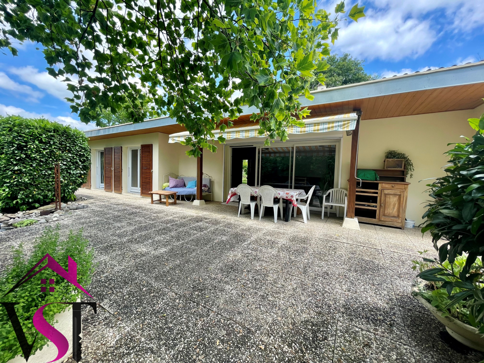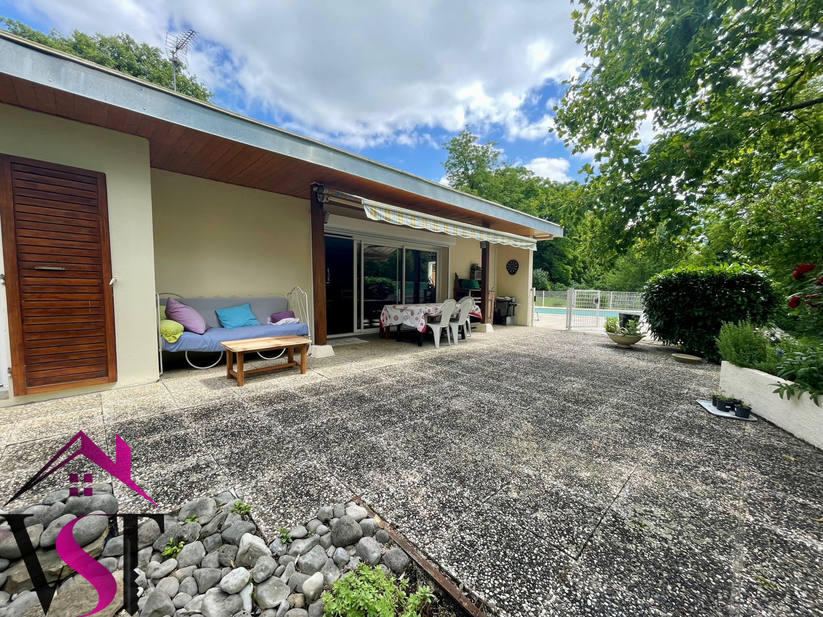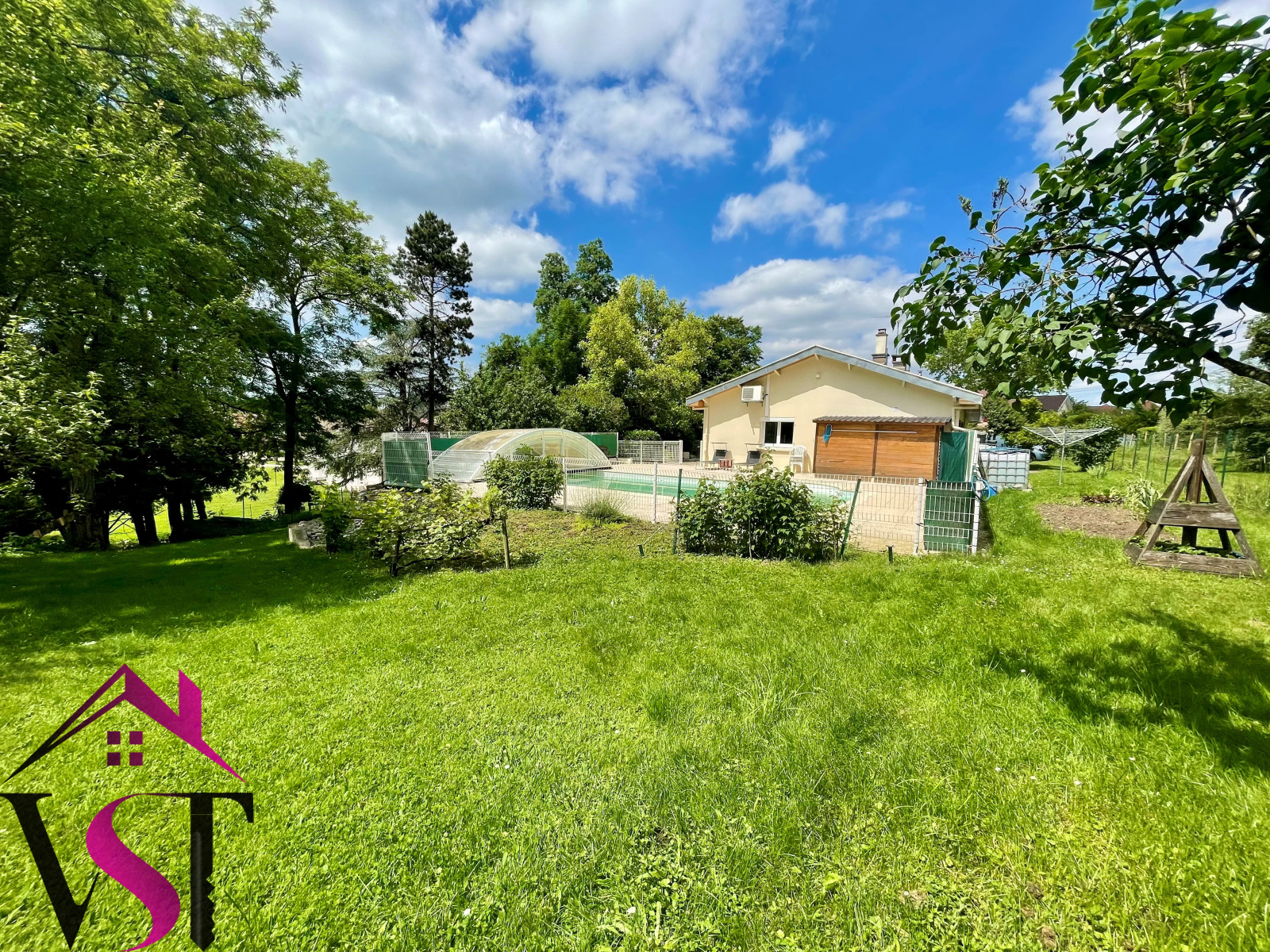 Terrain clos et arboré sans vis-à-vis avec grande piscine enterrée couverte (10x5) chauffée.